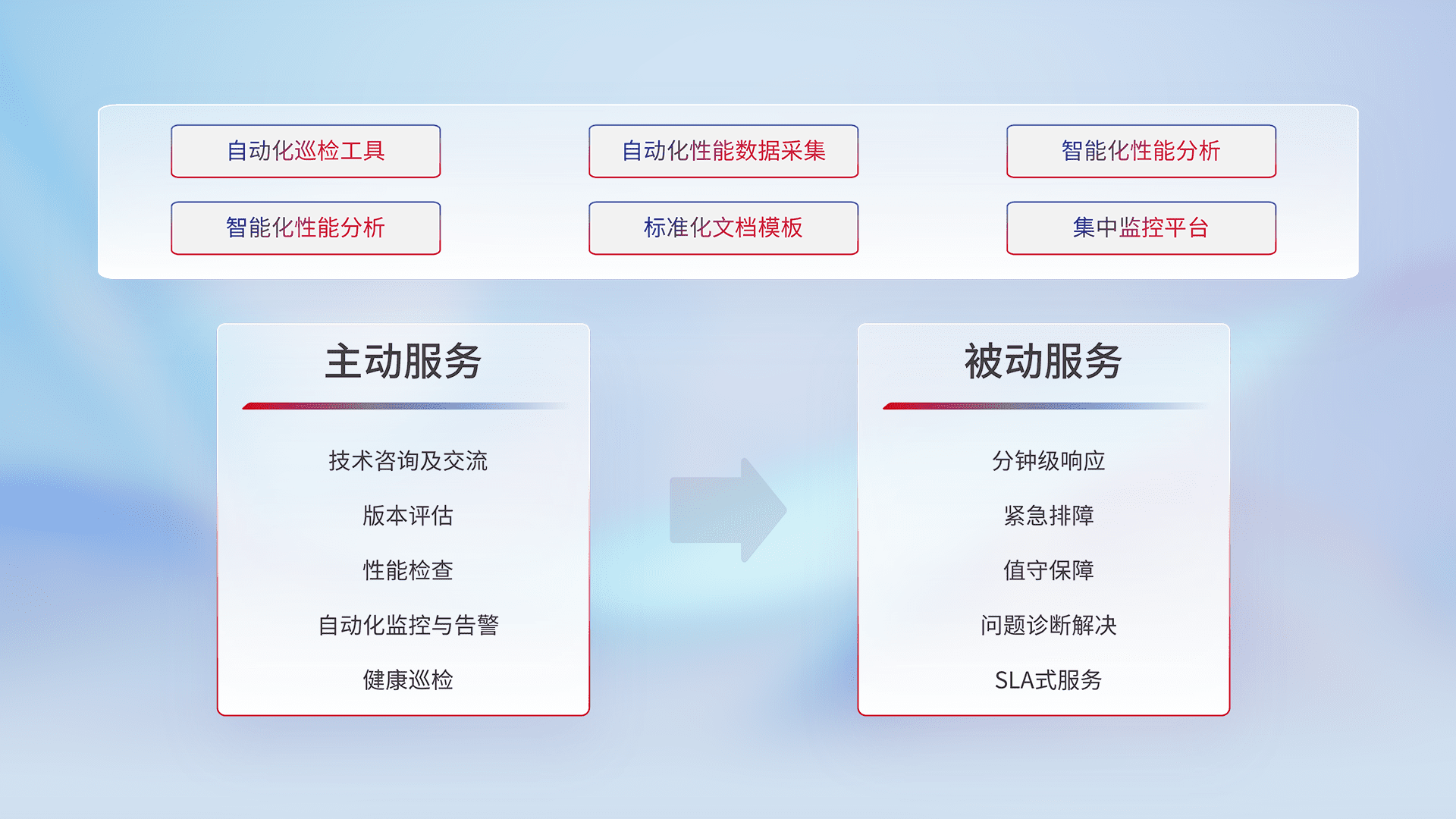 智能化工具和标准化文档,,,,保障服务质量,,提供主动服务(包含技术咨询、、、版本评估、、、性能检查、、、自动化监控与告警、、、、健康巡检)和被动服务包含(分钟级响应、、、、紧急排障、、、、值守保障、、问题诊断解决、、、、SLA服务)。。。